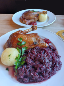 Mit traditionellen Klassikern wie knuspriger Gans, Hirschkalbsbraten, Rinderroulade und weiteren, sowie diversen Beilagen.